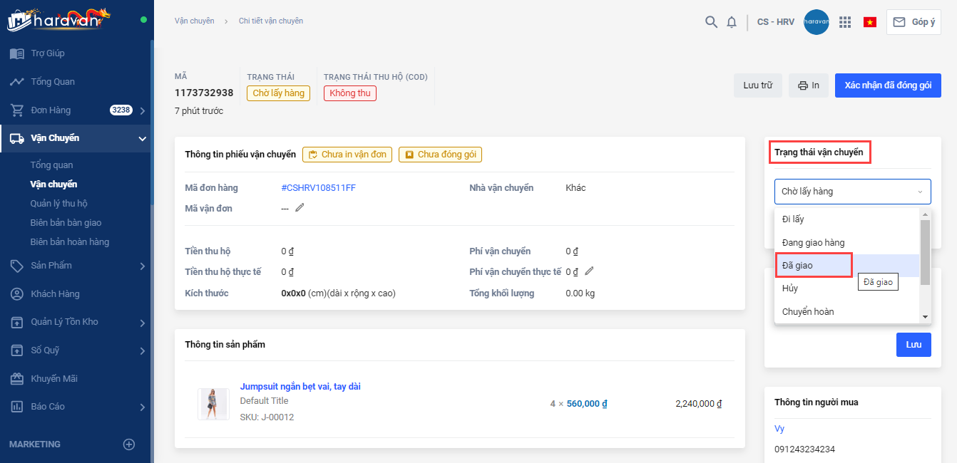 Tại mục Trạng thái vận chuyển của vận đơn, bạn chọn Đã giao