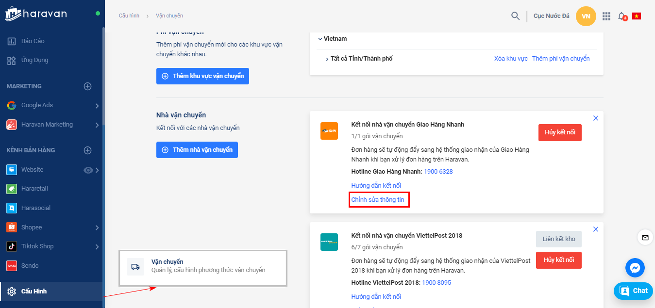 Để thực hiện kết nối thêm kho, nhà bán hàng vào Cấu hình -> Vận chuyển -> chọn nhà vận chuyển Giao hàng nhanh -> Chỉnh sửa thông tin
