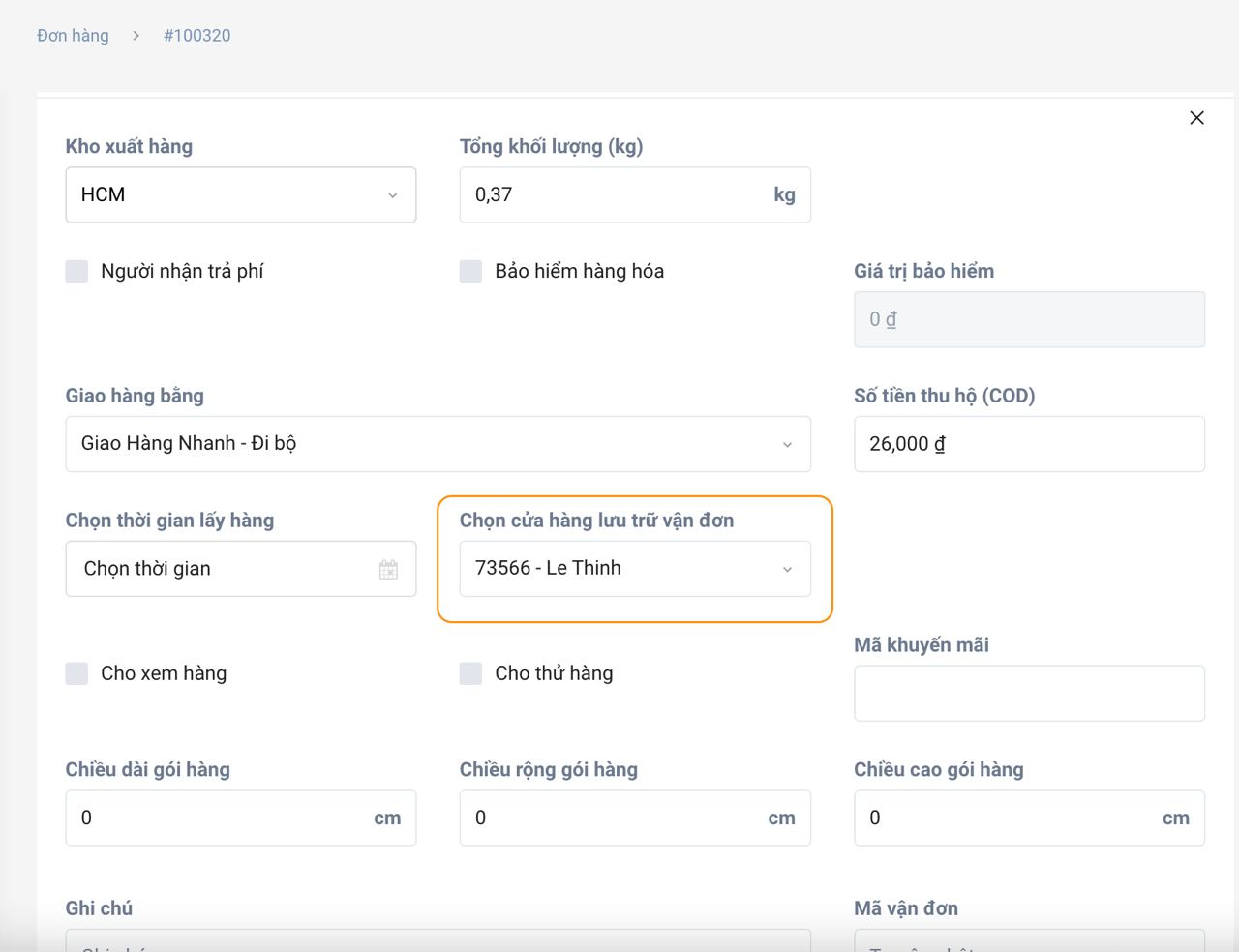 Thực hiện thêm kho trong mục Chọn cửa hàng để lưu trữ đơn giao hàng -> chọn Lưuđể hoàn tất