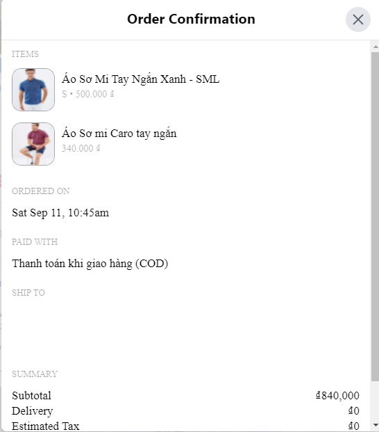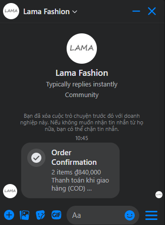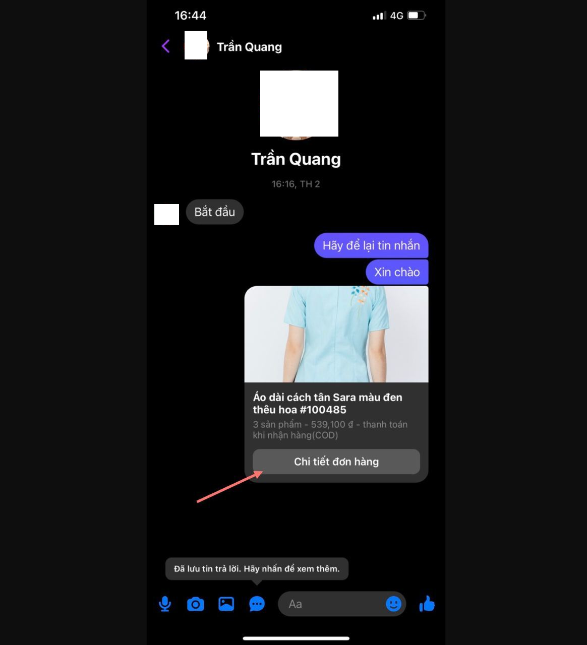 Trả lời:Sau khi khách hàng đã cung cấp đầy đủ họ tên, địa chỉ, số điện thoại; thông tin đơn hàng sẽ được gửi trực tiếp vào khung chat với khách hàng như sau: