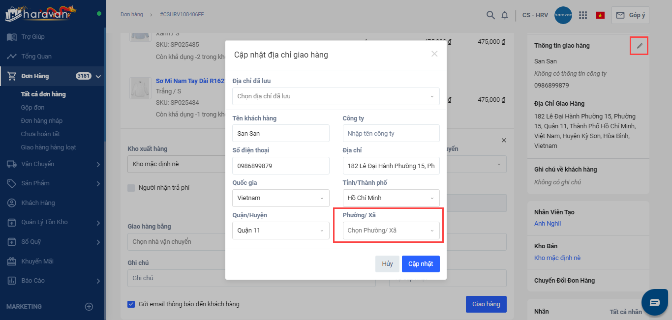 Bạn chọn vào biểu tượng ✏ ở mục Thông tin giao hàng và cập nhật thông tin Phường xã -> chọn Cập nhật để hoàn tất