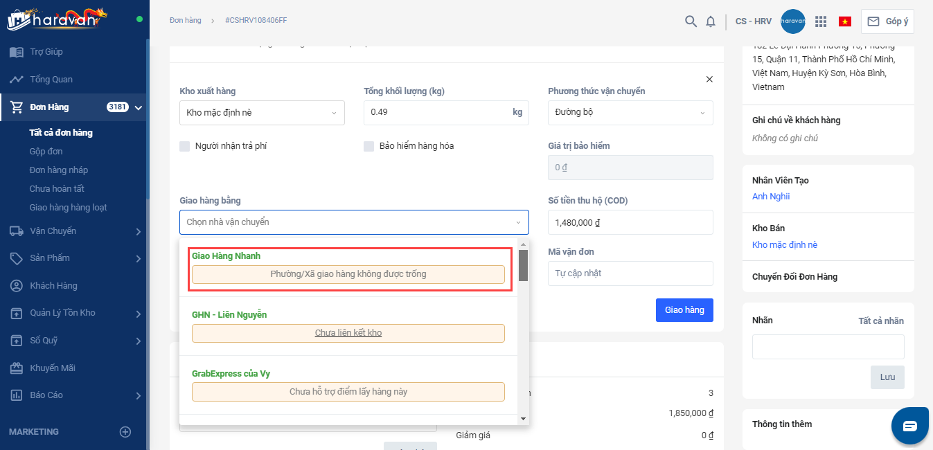 Vấn đề: Khi chọn nhà vận chuyển để tạo vận đơn, bạn gặp lỗi "Phường/xã giao hàng không được trống"