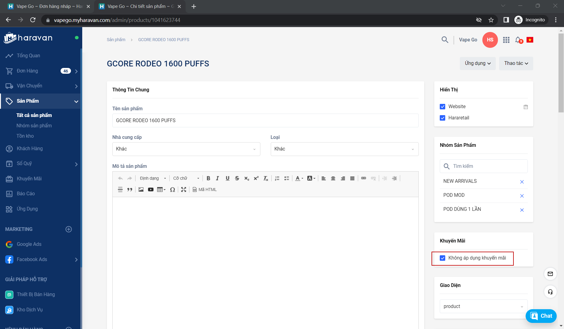 Bỏ chọn "Không áp dụng khuyến mãi" trong thiết lập sản phẩm.