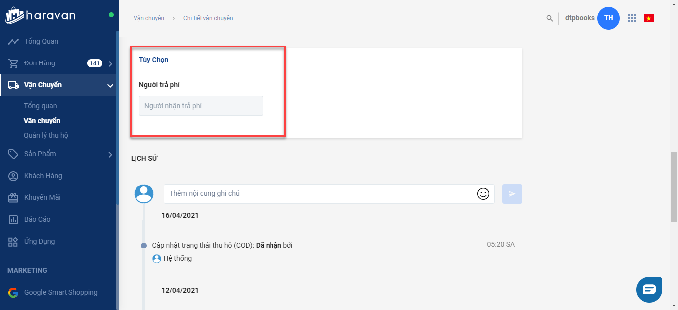 Để kiểm tra đơn hàng có chọn Người nhận trả phí/ Cho xem hàng hay không, bạn vào Vận chuyển > chi tiết mã vận chuyển và kiểm tra như hình nhé: