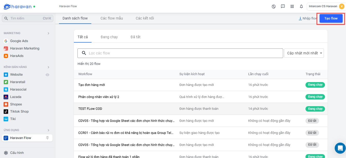 - Tại màn hình ứng dụng Haravan Flow, bạn chọn Tạo Flow