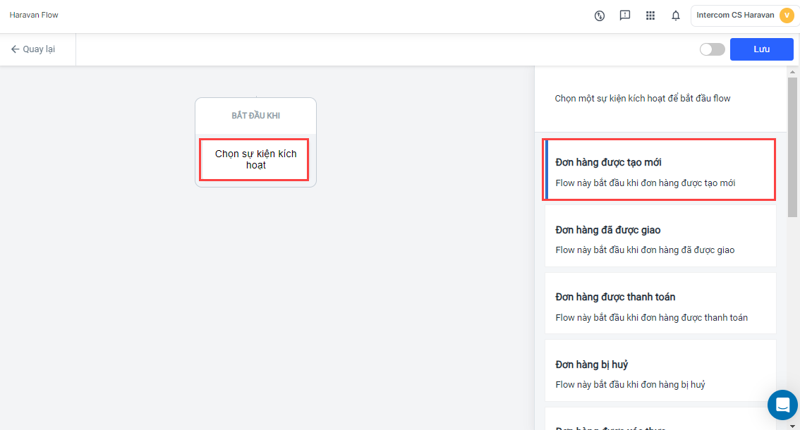 2. Chọn Sự kiện kích hoạt và chọn Đơn hàng được tạo mới