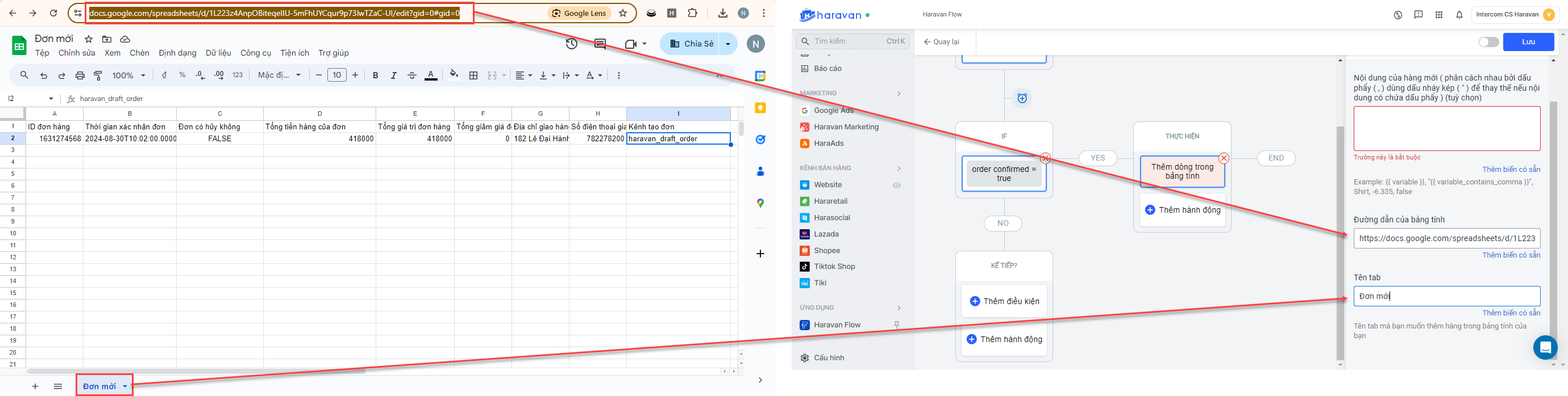 Bạn có thể sử dụng ứng dụng Haravan Flow để tạo một luồng tự động ghi nhận đơn mới vào Google Sheet.