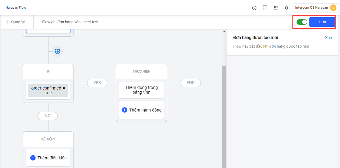 Haravan sẽ gợi ý cho bạn một luồng tự động ghi nhận đơn hàng vào Google Sheet khi đơn mới được xác thực. Bạn có thể áp dụng theo gợi ý này hoặc tạo những điều kiện khác tùy theo nhu cầu của mình.