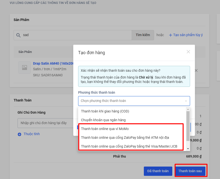 Khi tạo đơn hàng, nhà bán hàng chọn "thanh toán sau" rồi chọn 1 cổng thanh toán online bất kỳ