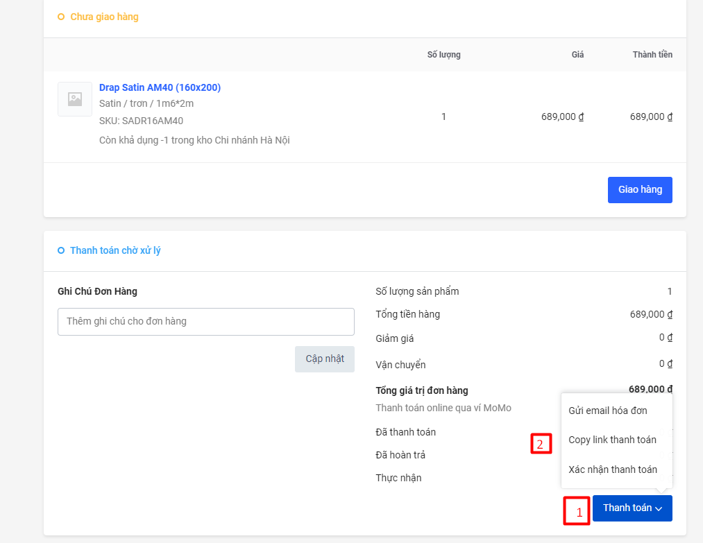 Khi đó đơn hàng sẽ có giao diện như hình dưới. Nhà bán hàng chỉ cần nhấn vào "thanh toán" => chọn Copy link thanh toán rồi gửi cho khách hàng. Lúc này khách hàng sẽ truy cập link đó và nếu thanh toán thành công sẽ thanh toán cho đúng đơn hàng mà nhà bán đã tạo cho khách.