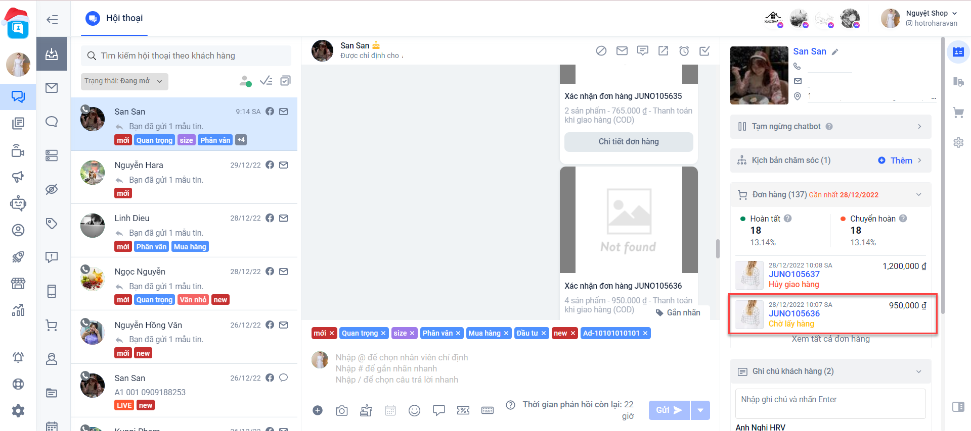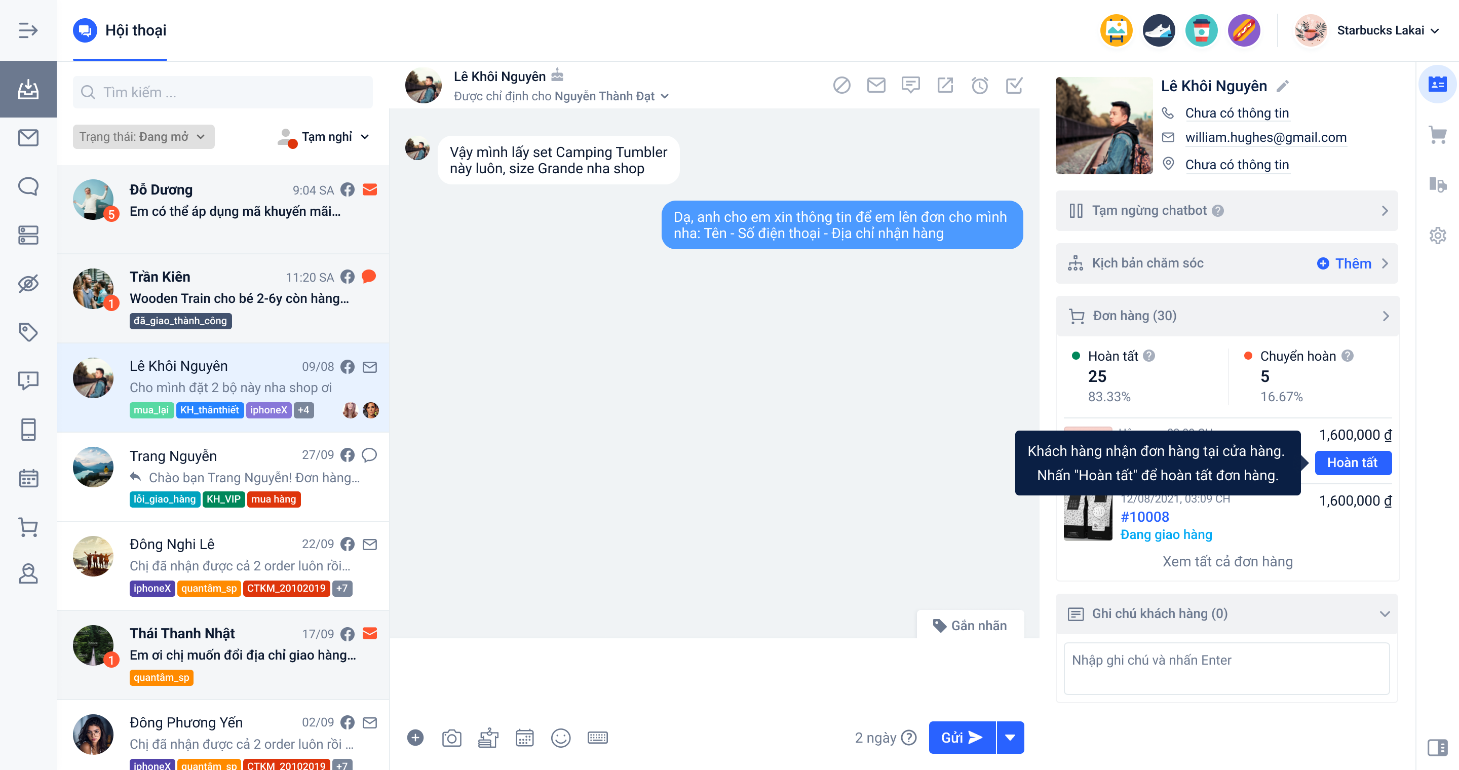 **Nguyên nhân:**Khách hàng mua hàng từ website và lựa chọn phương thức Nhận tại cửa hàng (bao gồm thanh toán COD hay ví điện tử online) => Khi đó tại thống kê các đơn hàng gần nhất tại Harasocial sẽ thay thế nút "Giao hàng" sang nút "Hoàn tất".
