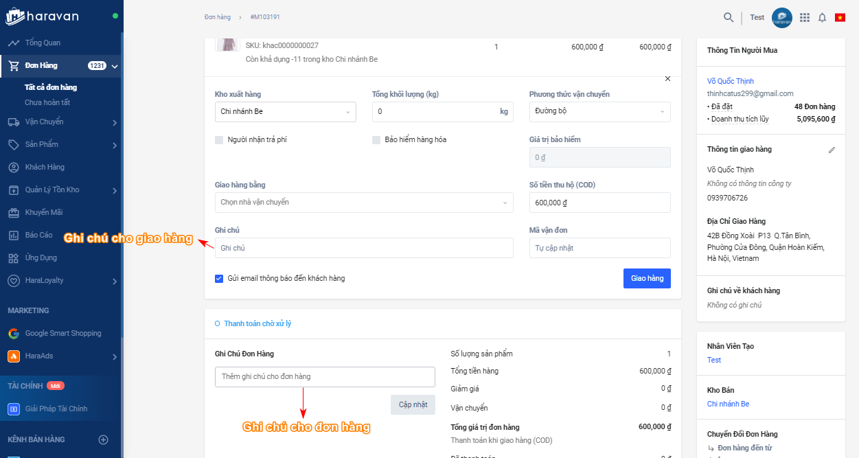 Một là ghi chú cho đơn hàng. Ghi chú này là ghi chú của khách hàng đến nhân viên cửa hàng hoặc chủ cửa hàng.