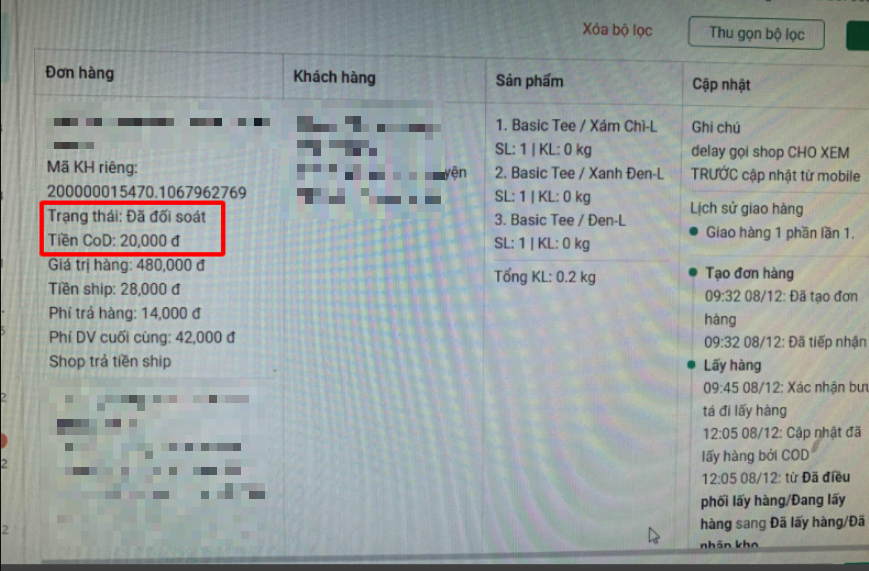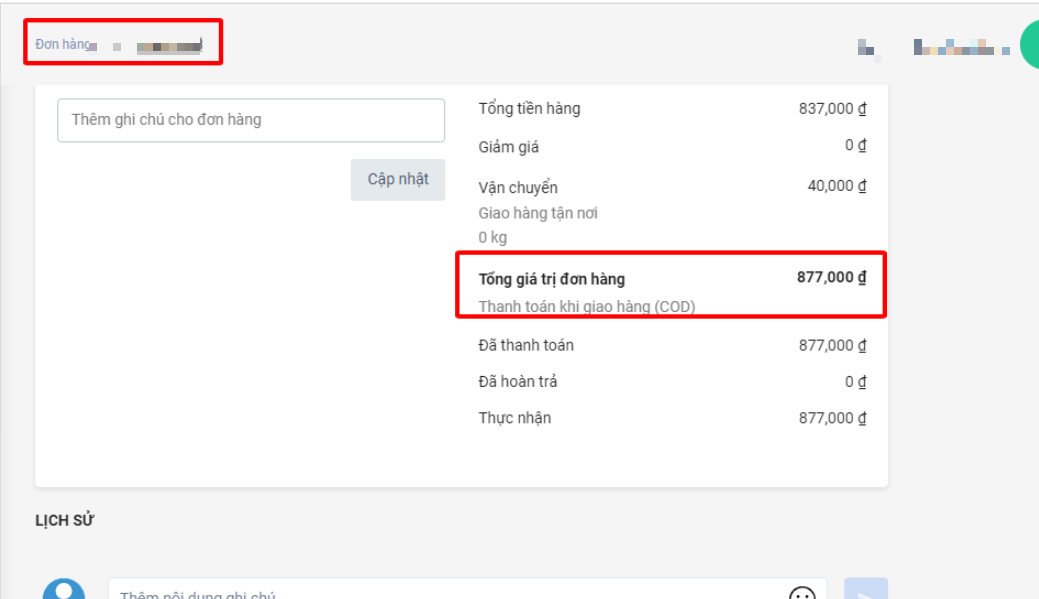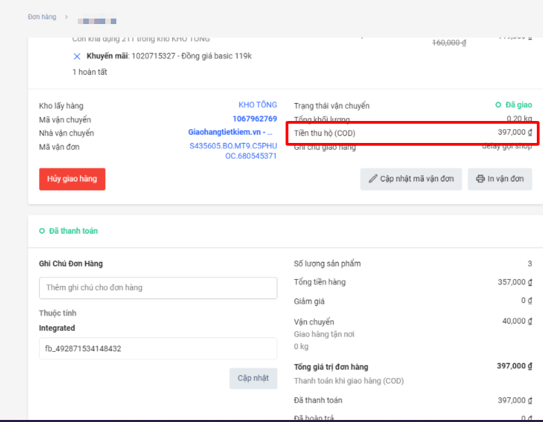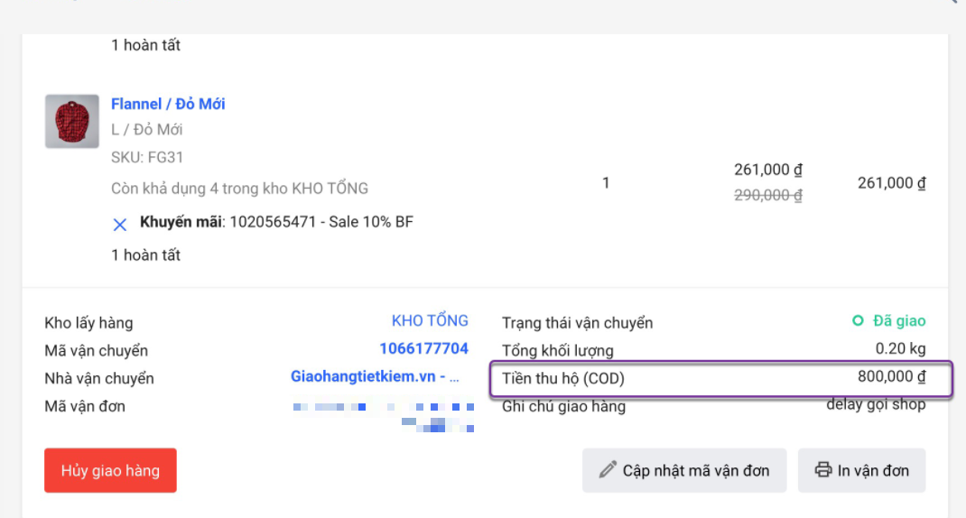 - Đơn hàng 2: Phía người bán đã vào GHTK để điều chỉnh lại tiền COD nên tổng giá trị đơn hàng và COD bên nhà vận chuyển không khớp. Khi thực hiện giao hàng thì hệ thống có cập nhật COD.