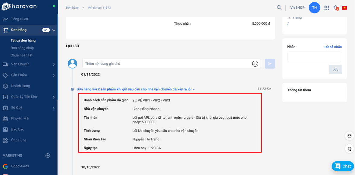 Khách hàng xử lý giao hàng qua đơn vị vận chuyển Giao Hàng Nhanh với các đơn trên 5 triệu báo lỗi "Giá trị khai giá vượt quá mức cho phép: 5000000"