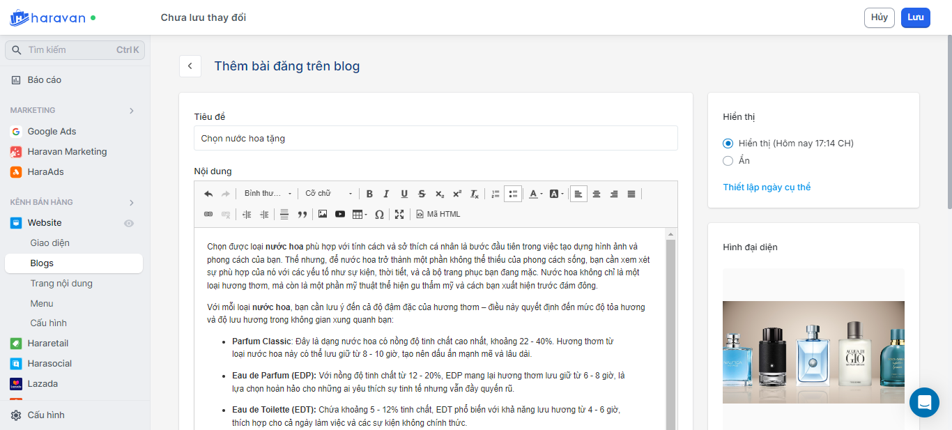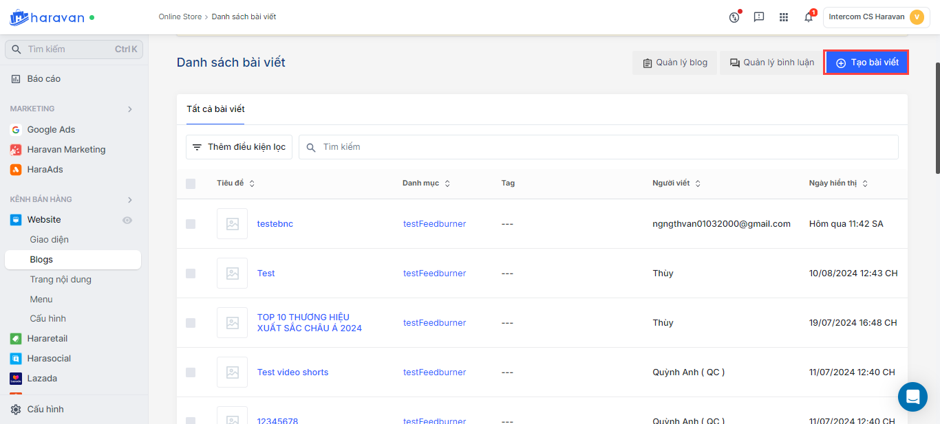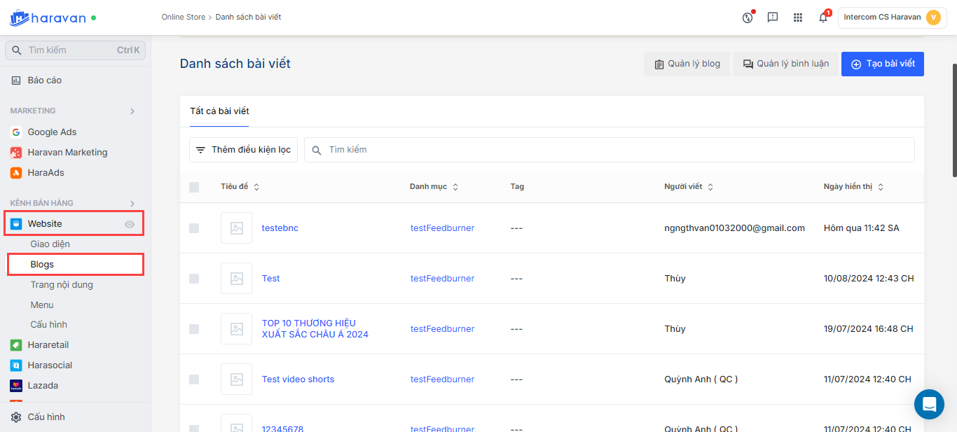 - Truy cập vào admin Haravan, mục Kênh bán hàng, chọn mục Website và chọn Blogs