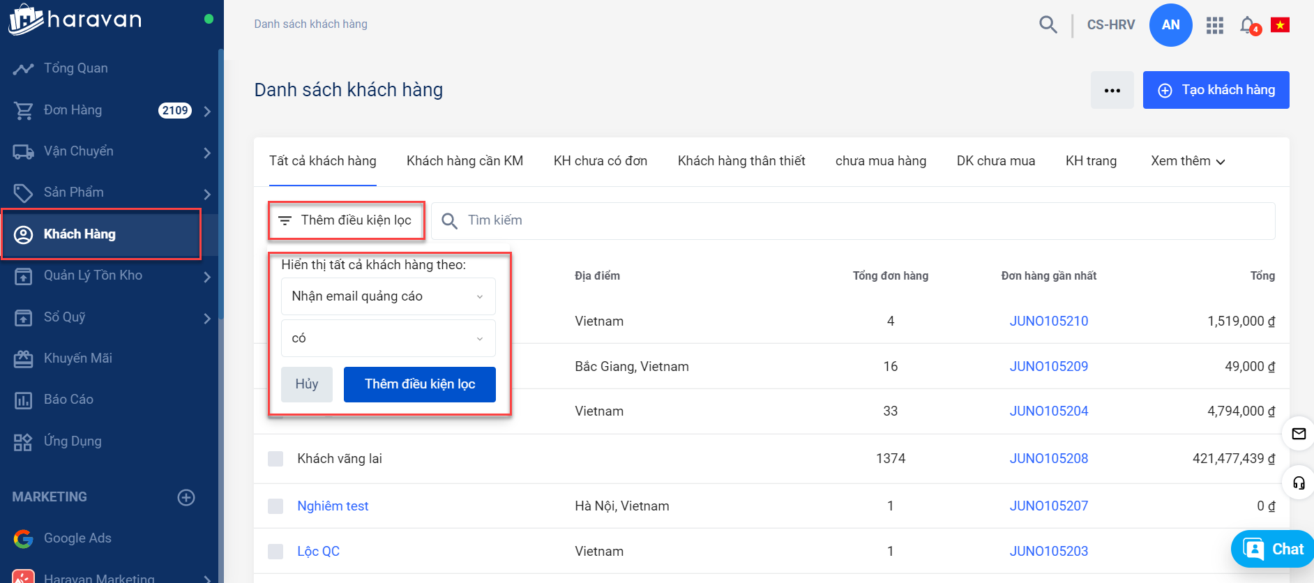 Đầu tiên, bạn vào Trang quản trị ➨ Khách hàng. Trong điều kiện lọc, chọn điều kiện Nhận email quảng cáo, Có. ➨ Thêm điều kiện lọc. Sau đó, chọn xuất dữ liệu để có được danh sách khách hàng đăng ký nhận mail.