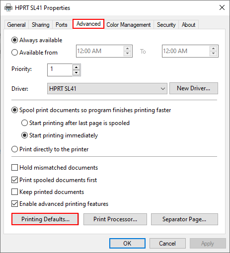 **Bước 4:**Chọn thẻ Advanced → Printing Default