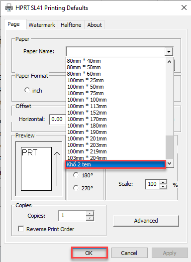 **Bước 5:**Tại ô paper name, bạn chọn khổ in bạn đang muốn in (đây là khổ in thiết lập trong bài hướng dẫn thiết lập khổ in). Chọn OK