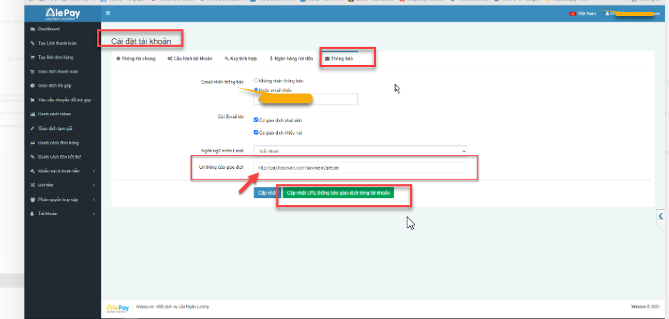 Tại mụcCài đặt tài khoản >> Thông báo >> URL thông báo giao dịch >> Nhập link "https://pay.haravan.com/payment/alepay"