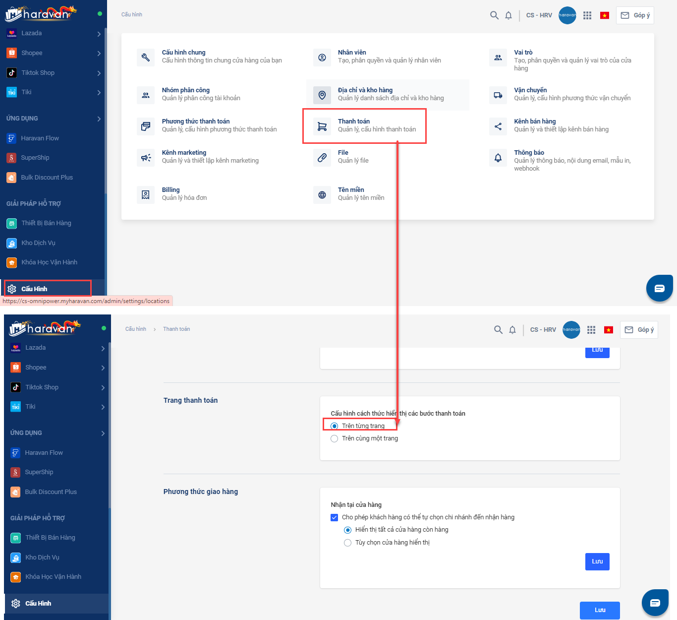 Để thiết lập, bạn vào mục Cấu hình ->chọn Thanh toán-> Tại mụcTrang thanh toán-> chọnTrên từng trang