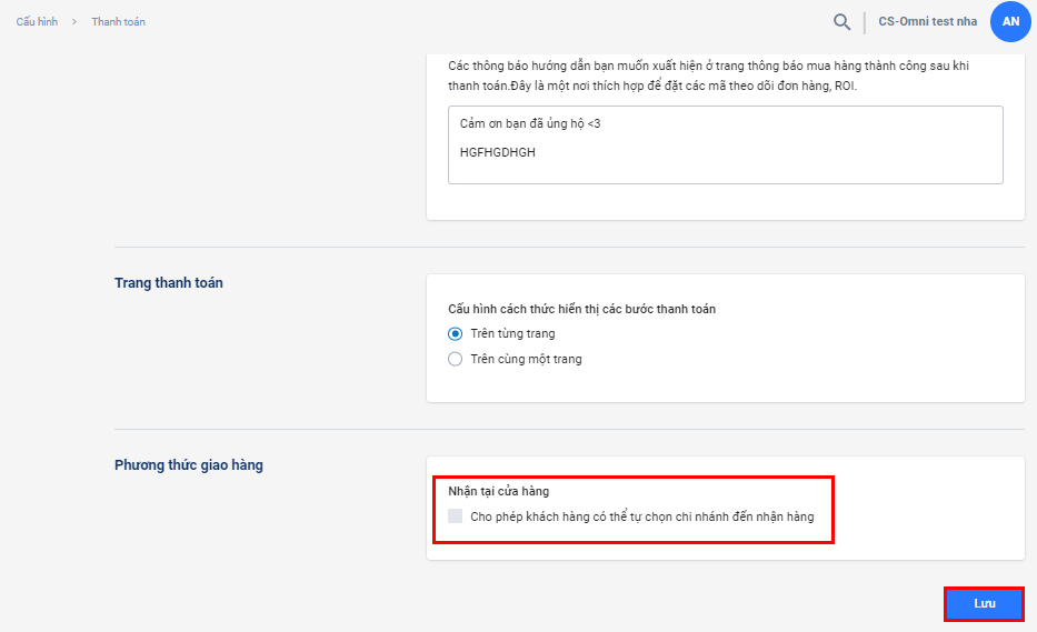 Để tắt lựa chọn Nhận tại cửa hàng trên trang thanh toán, nhà bán hàng thực hiện:
