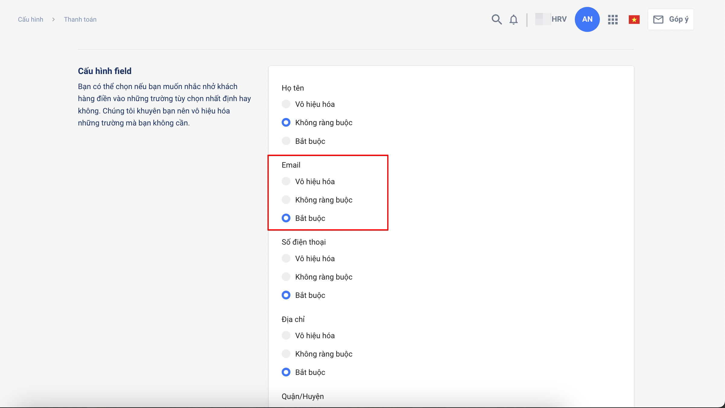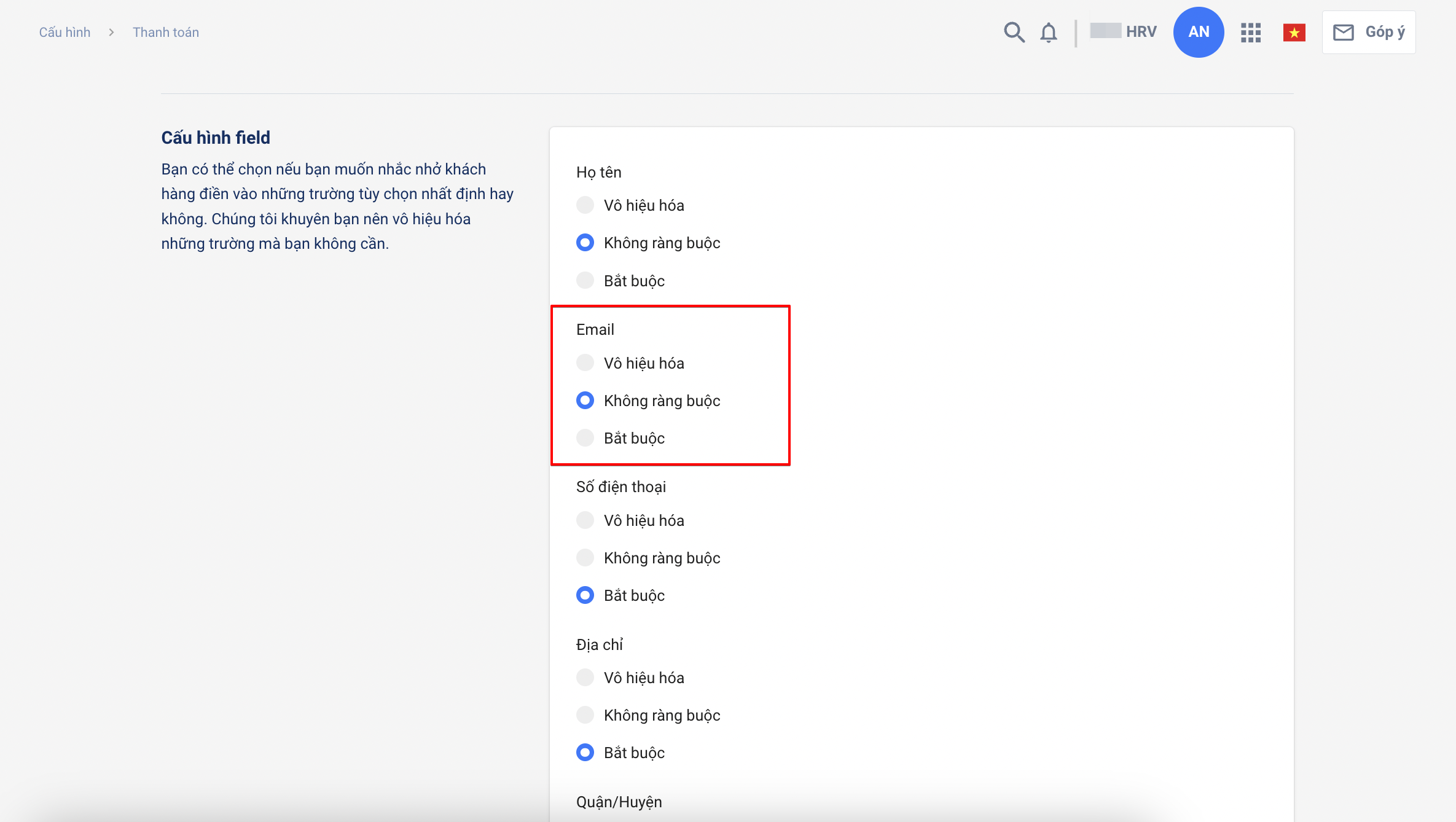 - Admin đang chọnCấu hình > Thanh toán > Cấu hình field > Bắt buộc nhập email