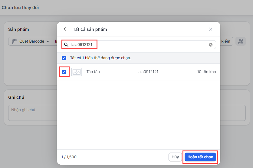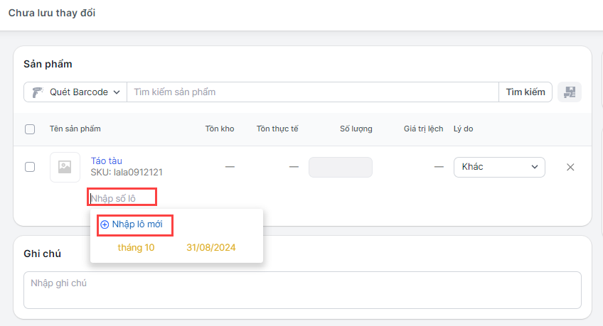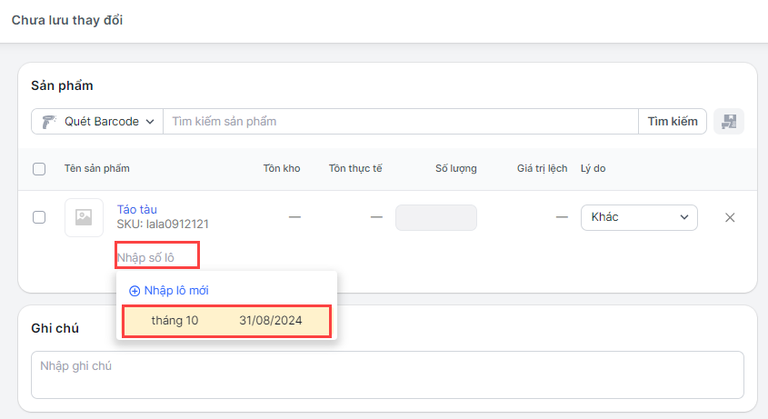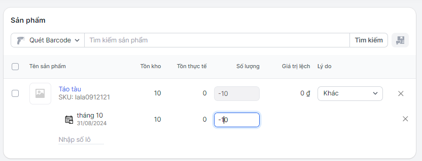 - Thêm sản phẩm cần chỉnh sửa lô vào phiếu