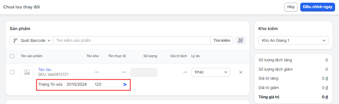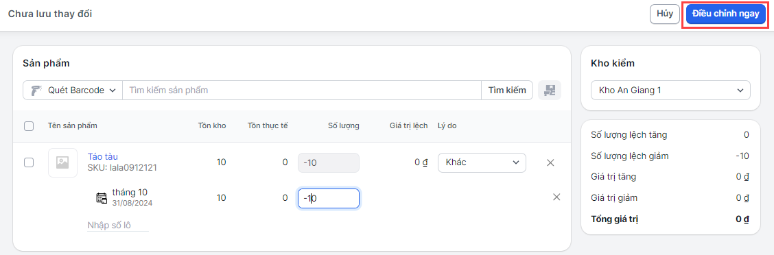 - Thao tác điều chỉnh nhanh sẽ cộng dồn số lượng sản phẩm trên phiếu vào số tồn hiện tại, do đó, để điều chỉnh về bằng 0, bạn cần nhập số lượng âm