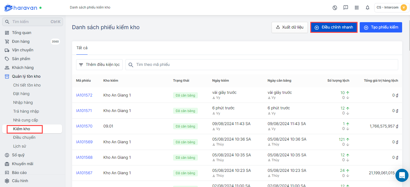 - Tại mục Quản lý tồn kho, bạn chọn Kiểm kho và chọn Điều chỉnh nhanh
