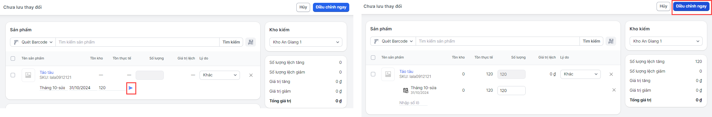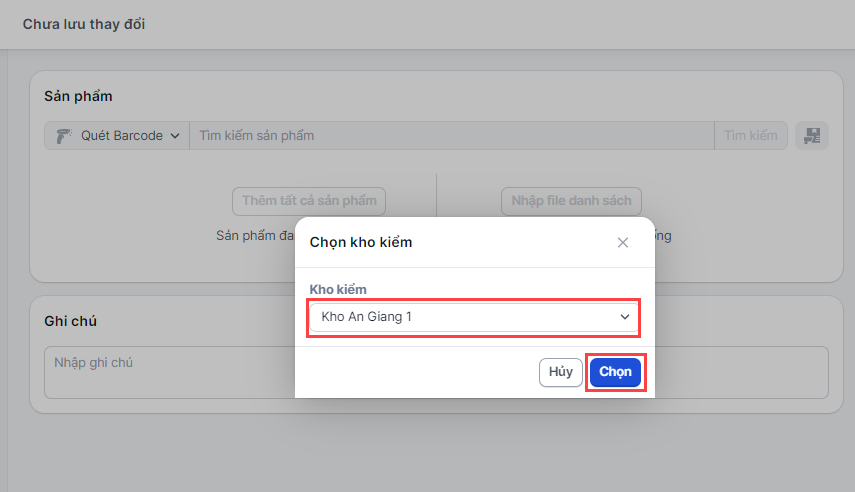 - Chọn kho có chứa lô sản phẩm cần điều chỉnh tồn