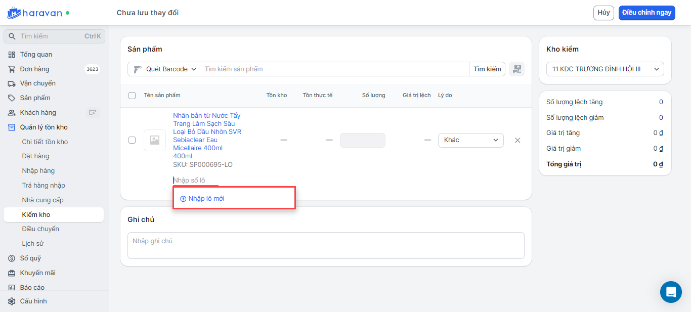 Sau khi đã có 1 sản phẩm mới có quản lý lô hạn sử dung, bạn thực hiện Kiểm kho để tạo lô và nhập số sản phẩm trong lô.