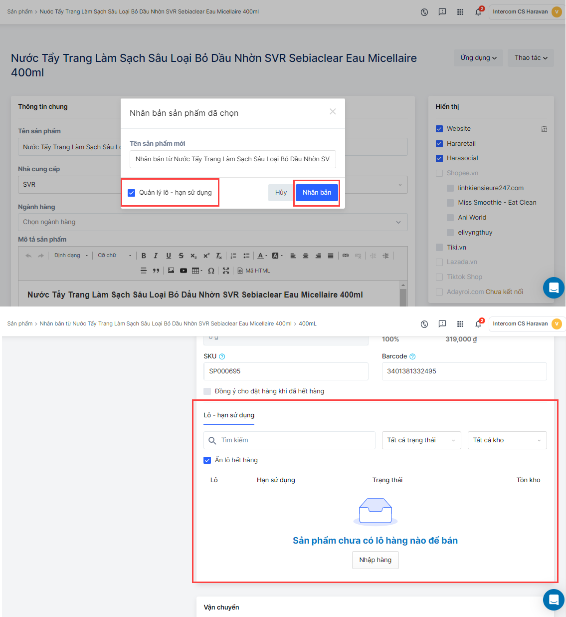 Haravan chưa hỗ trợ cập nhật lô hạn sử dụng cho sản phẩm đã tạo. Do đó, để cập nhật lô hạn sử dung cho sản phẩm đã tạo, bạn cần tạo một sản phẩm mới có tick chọn có Quản lý lô hạn sử dụng.