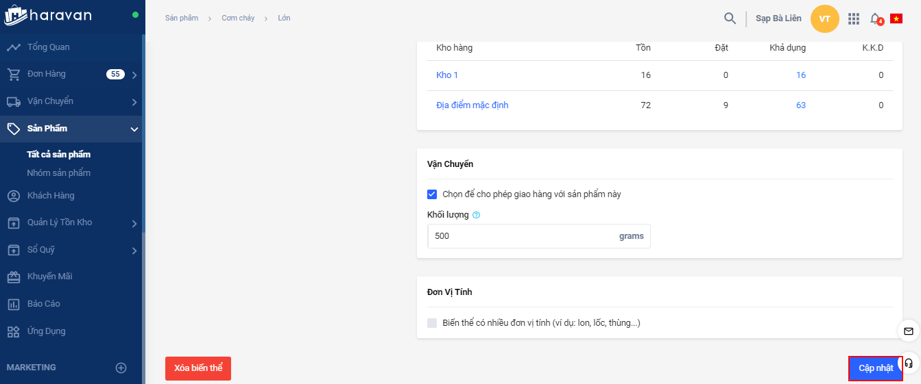 Trang quản trị -> Sản phẩm-> Chọn sản phẩm cần cập nhật