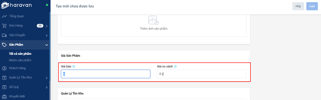 Bạn có thể thiết lập giá bán và giá so sánh ngay khi tạo một sản phẩm mới