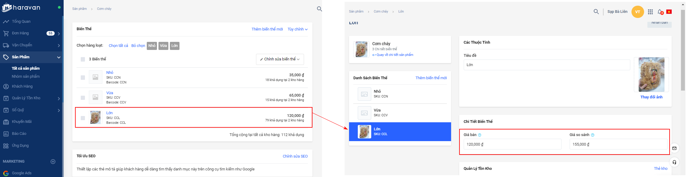 Chọn biến thể -> Tại mục Chi tiết biến thể bạn cập nhậtgiá bán và giá so sánh của sản phẩm