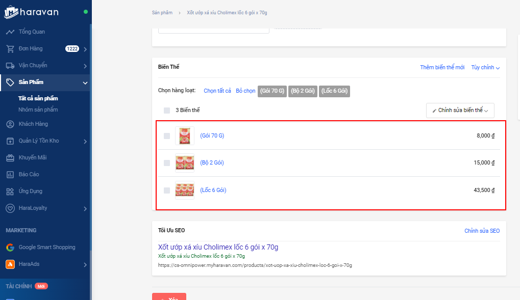 3. Bạn kéo xuống mục Biến thể,chọn biến thể muốn chỉnh sửa.