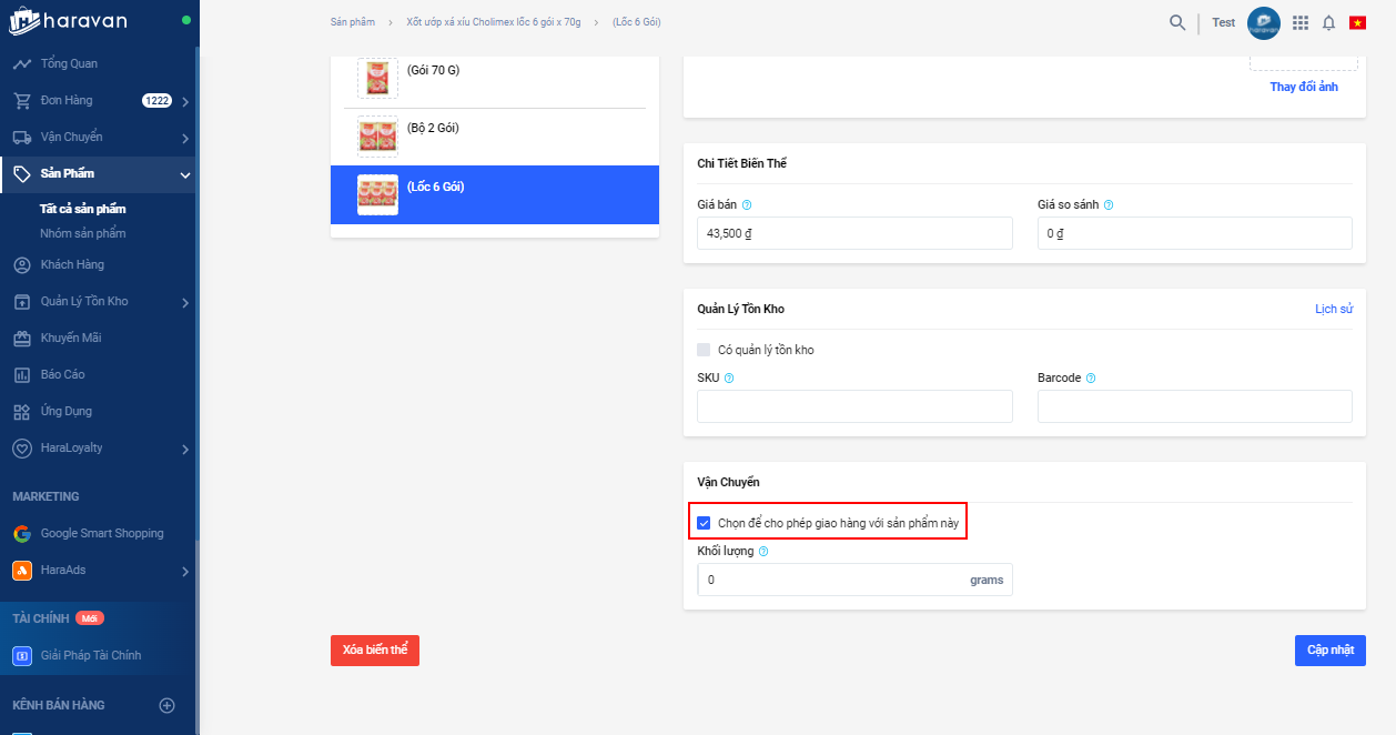 - Trong hộp thoại, bạn check chọn Có giao hàng -> Cậ**p nhật** để hoàn tất