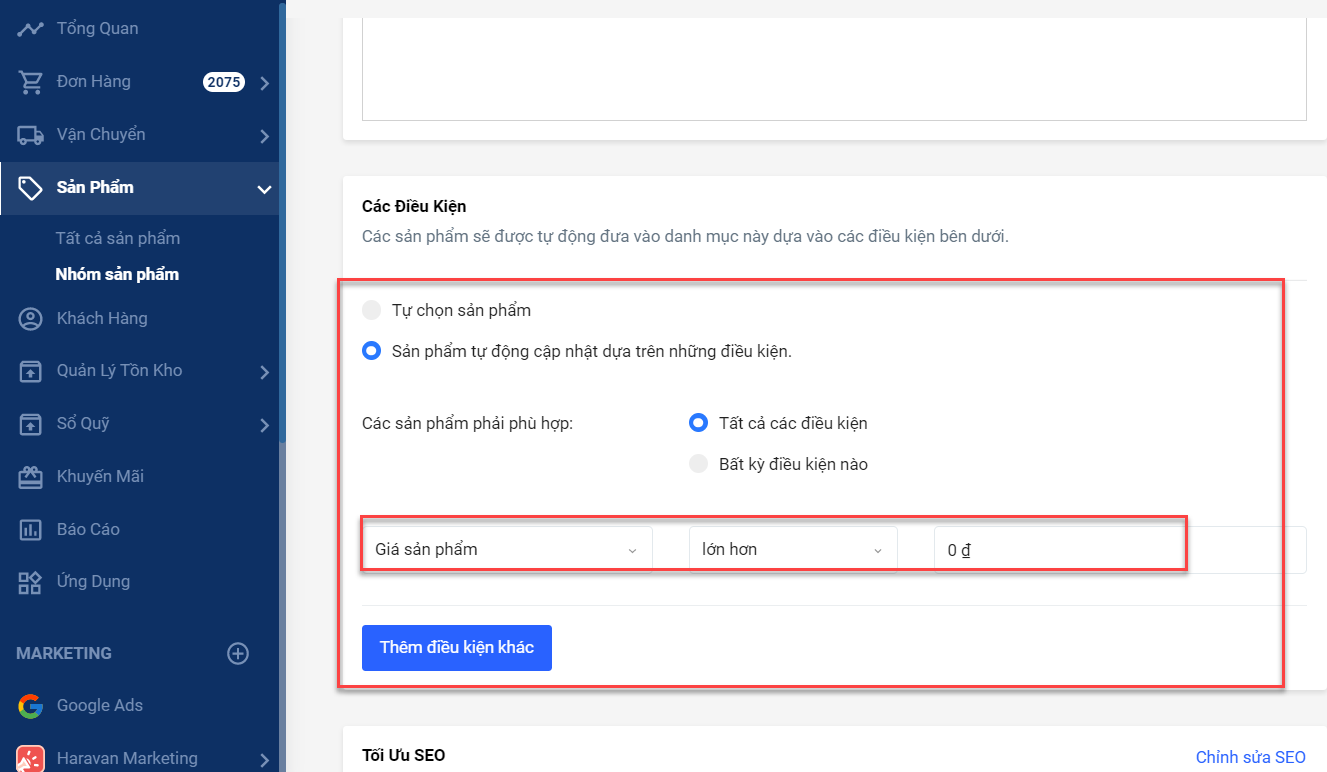 Bước 1: Tạo một nhóm sản phẩm tự động với điều kiện giá sản phẩm lớn hơn 0.