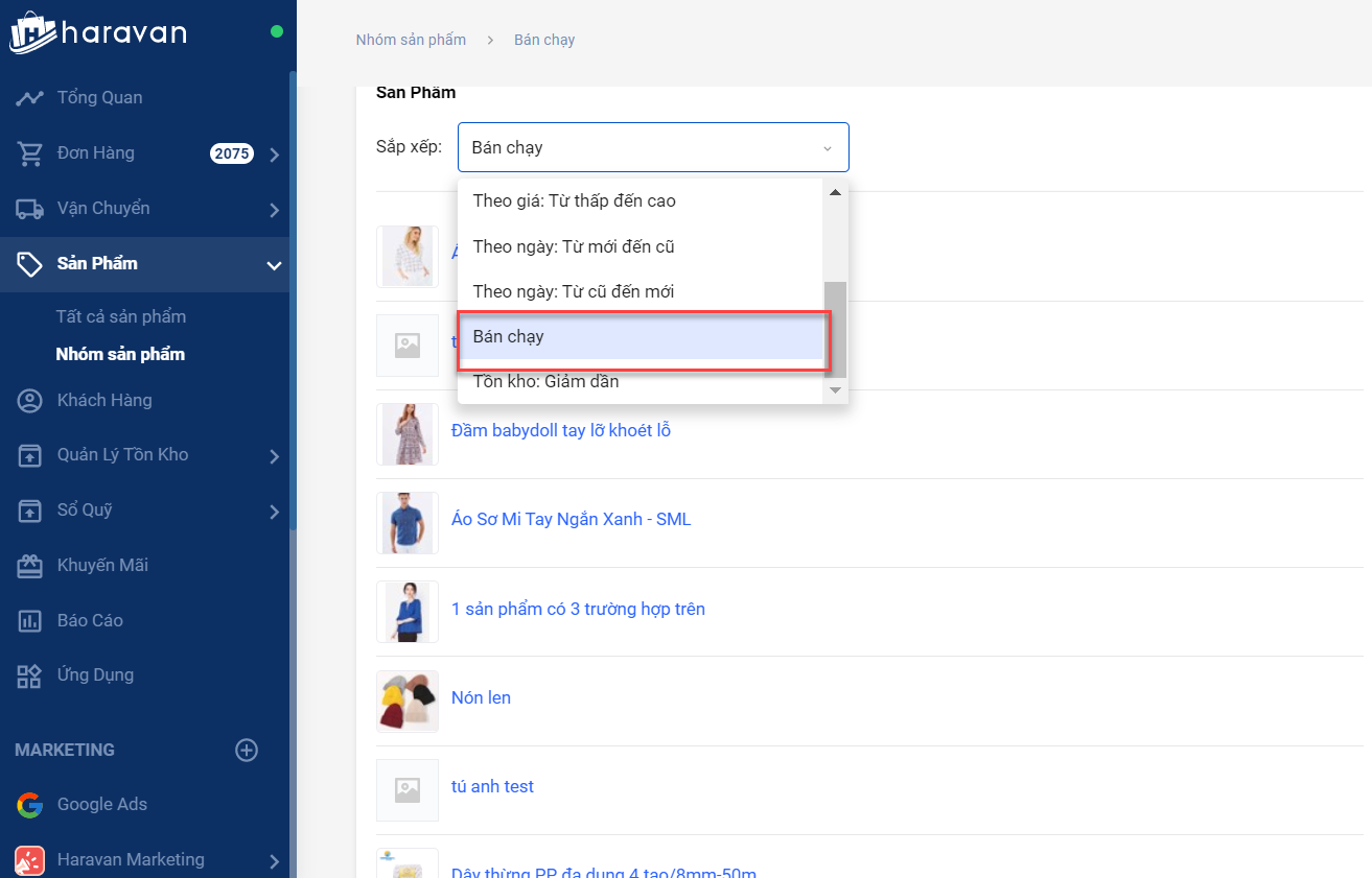 Bước 2: Sắp xếp nhóm sản phẩm theo điều kiện Bán chạy, hệ thống sẽ tự sắp xếp các sản phẩm bán chạy lên các vị trí đầu.