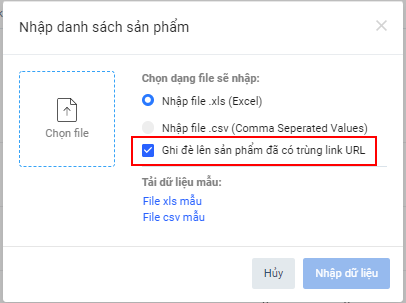 Lưu ý: Khi nhập file dữ liệu lên hệ thống, bạn phải chọn chế độ Ghi đè url, nếu không sản phẩm cũ không được cập nhật thông tin mà hệ thống sẽ thực hiện nhân đôi sản phẩm.