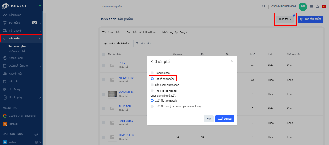 Đầu tiên bạn cần xuất file tất cả sản phẩm bằng cách vào tab Sản phẩm -> Thao tác -> Xuất dữ liệu mẫu theo Haravan -> chọn Tất cả sản phẩm. File danh sách sản phẩm sẽ được gửi về email của bạn.