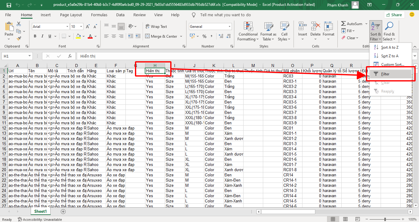 Bạn có thể sử dụng cách trên để tìm sản phẩm chưa có SKU. Bạn tìm và lọc trong cột Mã phiên bản (cột 0)
