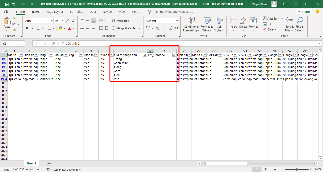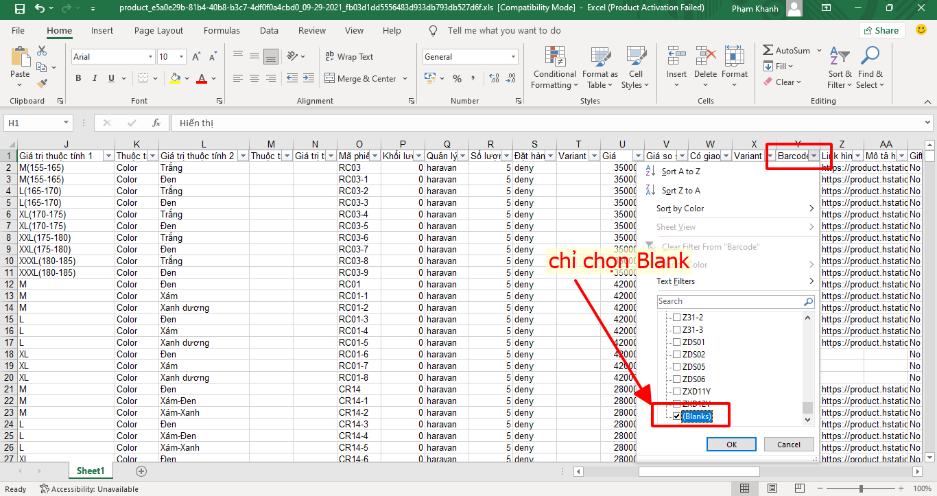 - Tìm tới Cột barcode -> chỉ chọn Blank -> loại bỏ các ô có giá trị: