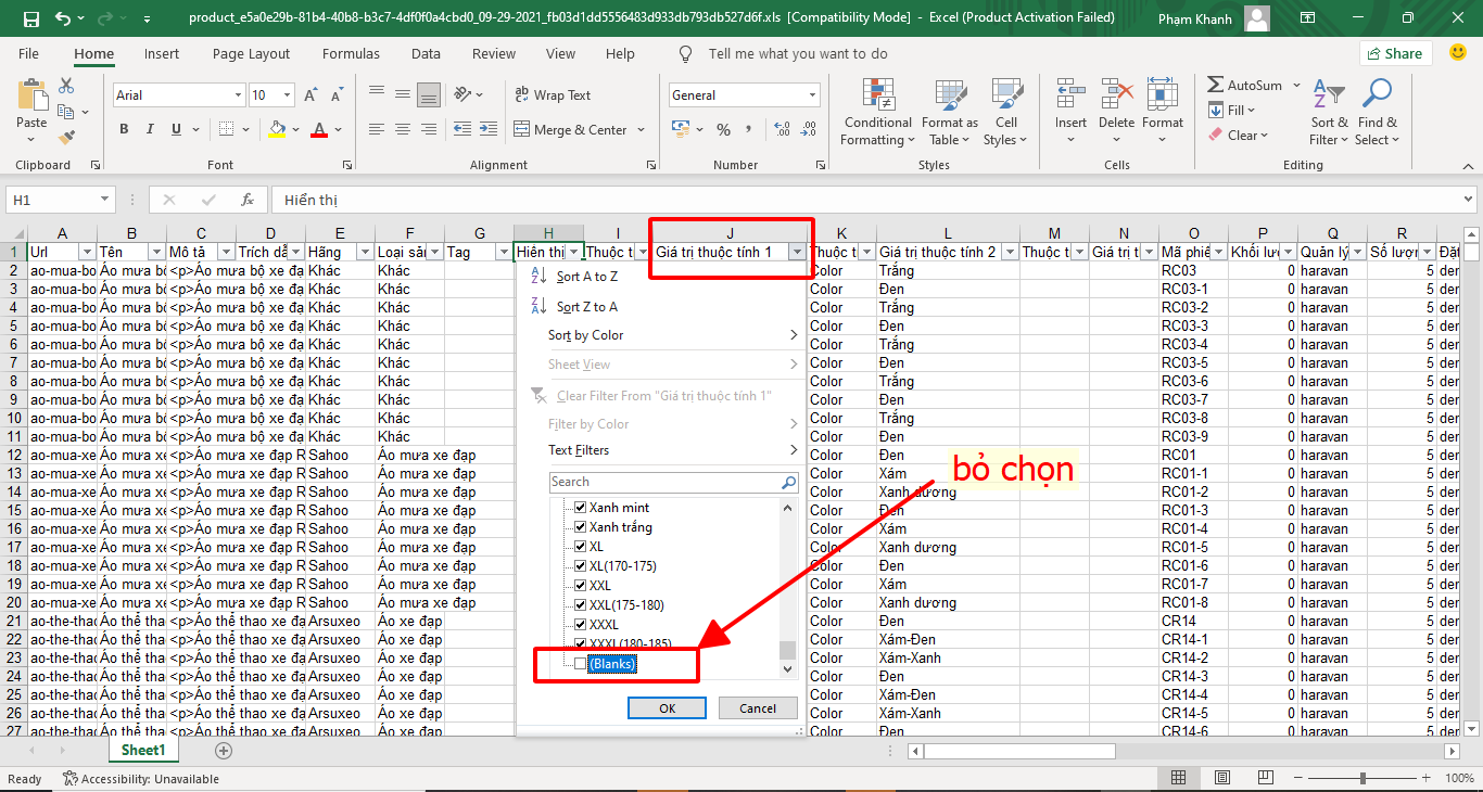 - Chọn cột Giá trị Thuộc tính 1 -> Bỏ ô Blank (Mục đích loại bỏ các hàng chứa link ảnh sản phẩm):
