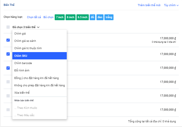 - Xóa biến thể: Chỉ có thể xóa khi số tồn, đặt, khả dụng của sản phẩm bằng 0.