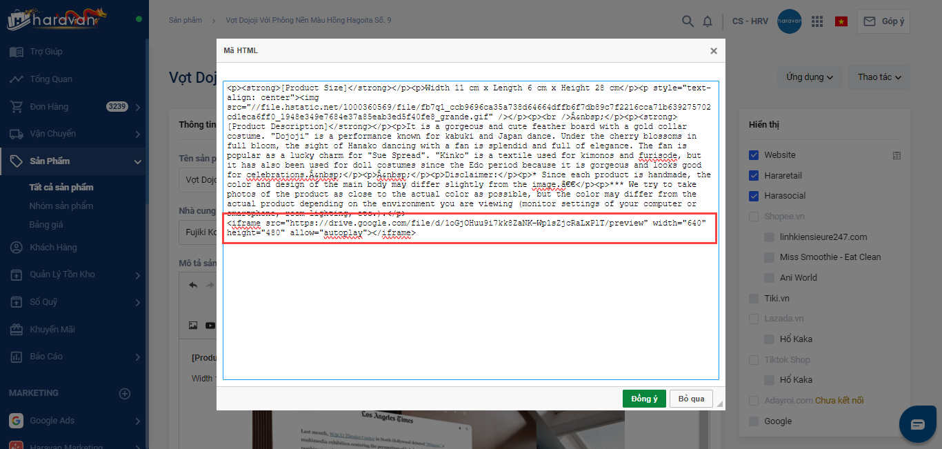 - Dán đoạn code có đường dẫn file doc hoặc file pdf vào vị trí muốn hiển thị trên phẩn mô tả sản phẩm -> chọn Đồng ý