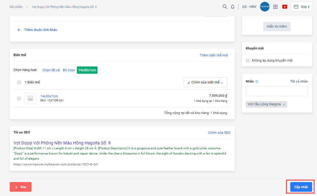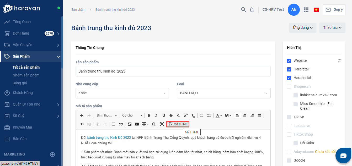 5.Vào mục sản phẩm, chọn sản phẩm cần chỉnh sửa mô tả sản phẩm. Tại mục mô tả sản phẩm, chọn Mã HTML