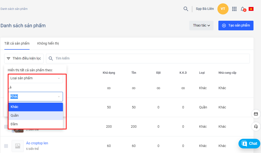 Ví dụ bạn muốn xóa loại sản phẩm là Phụ kiện. Bạn thực hiện lọc loại sản phẩm là Phụ kiện