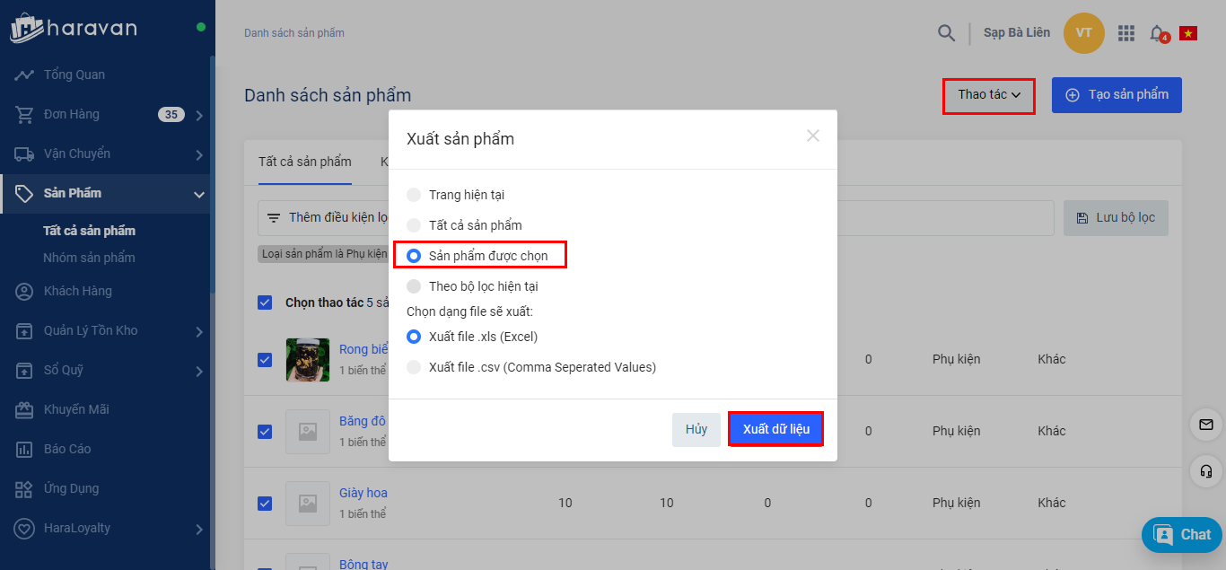Sau đó, bạn thực hiện xuất danh sách Sản phẩm được chọn