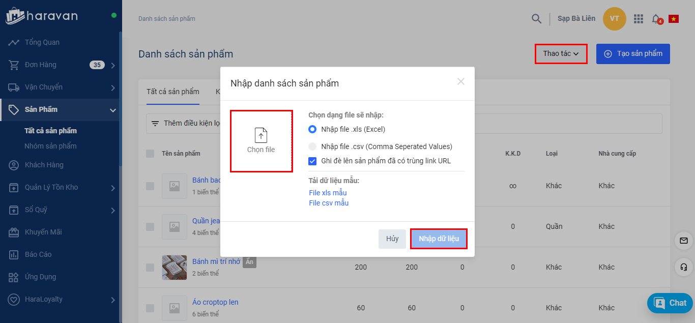 Lưu file và thực hiện nhập file lại lên hệ thống. Bạn chọn Thao tác -> Nhập dữ liệu -> Chọn File